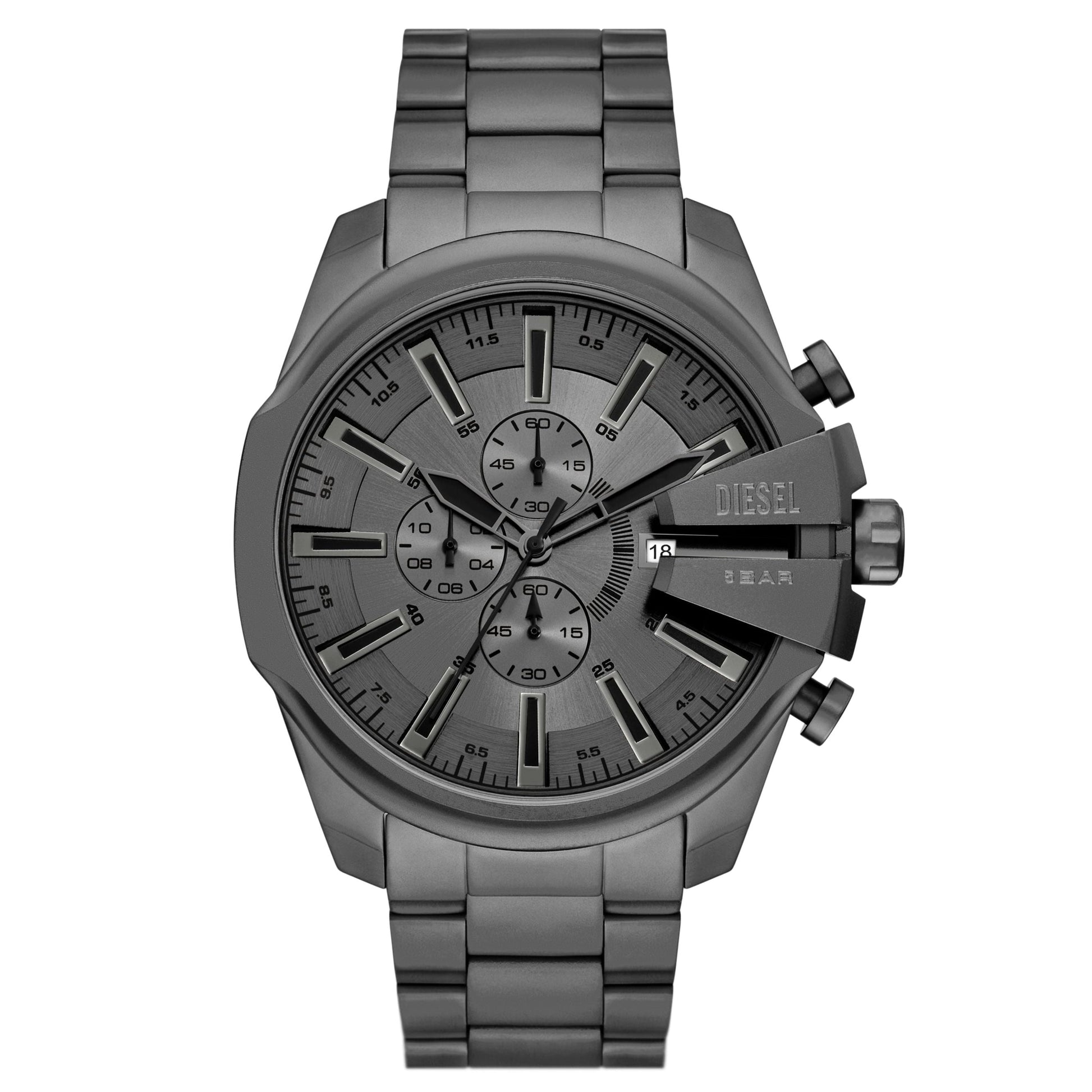 Diesel's 48mm Mega Chief Slim features a gray sunray dial, chronograph movement, and a brushed gray stainless steel bracelet.