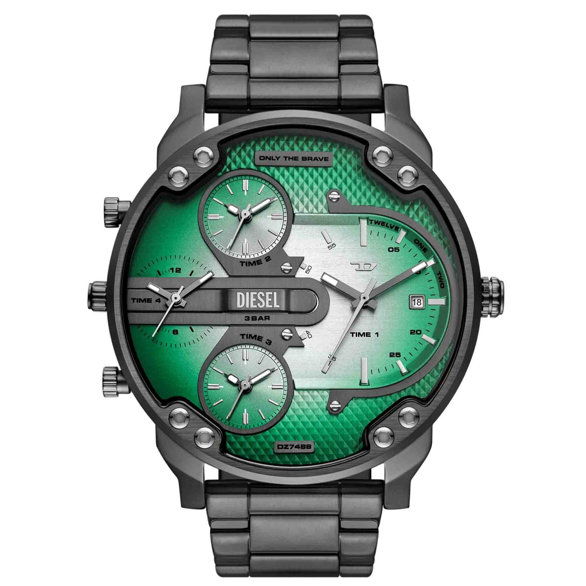 Diesel's 54mm Mr. Daddy Slim watch features a green and white dial, multi-movement and a gunmetal stainless steel bracelet.