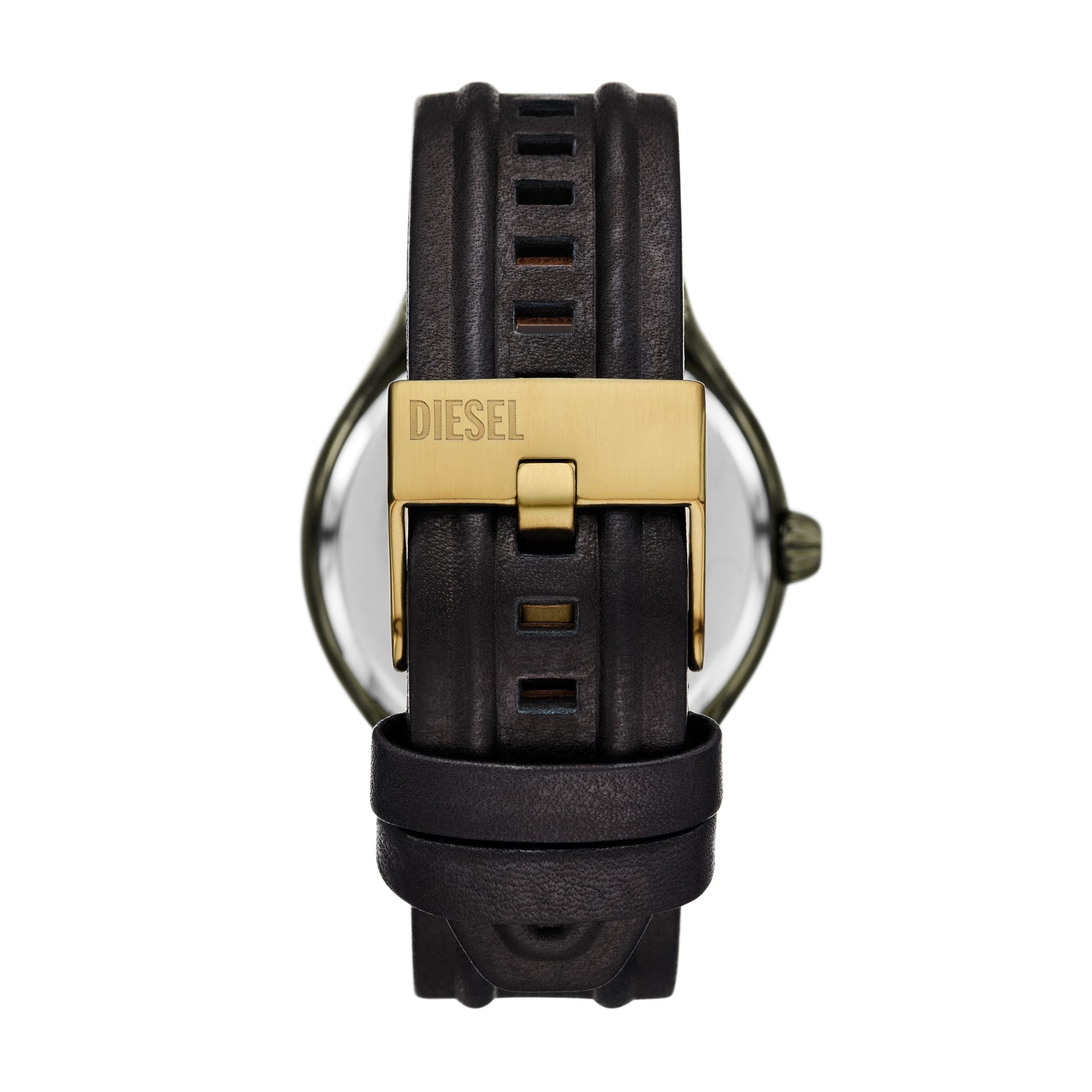 Diesel's 44mm Streamline watch features a green iridescent crystal, silver sunray dial, three-hand movement and black leather strap.