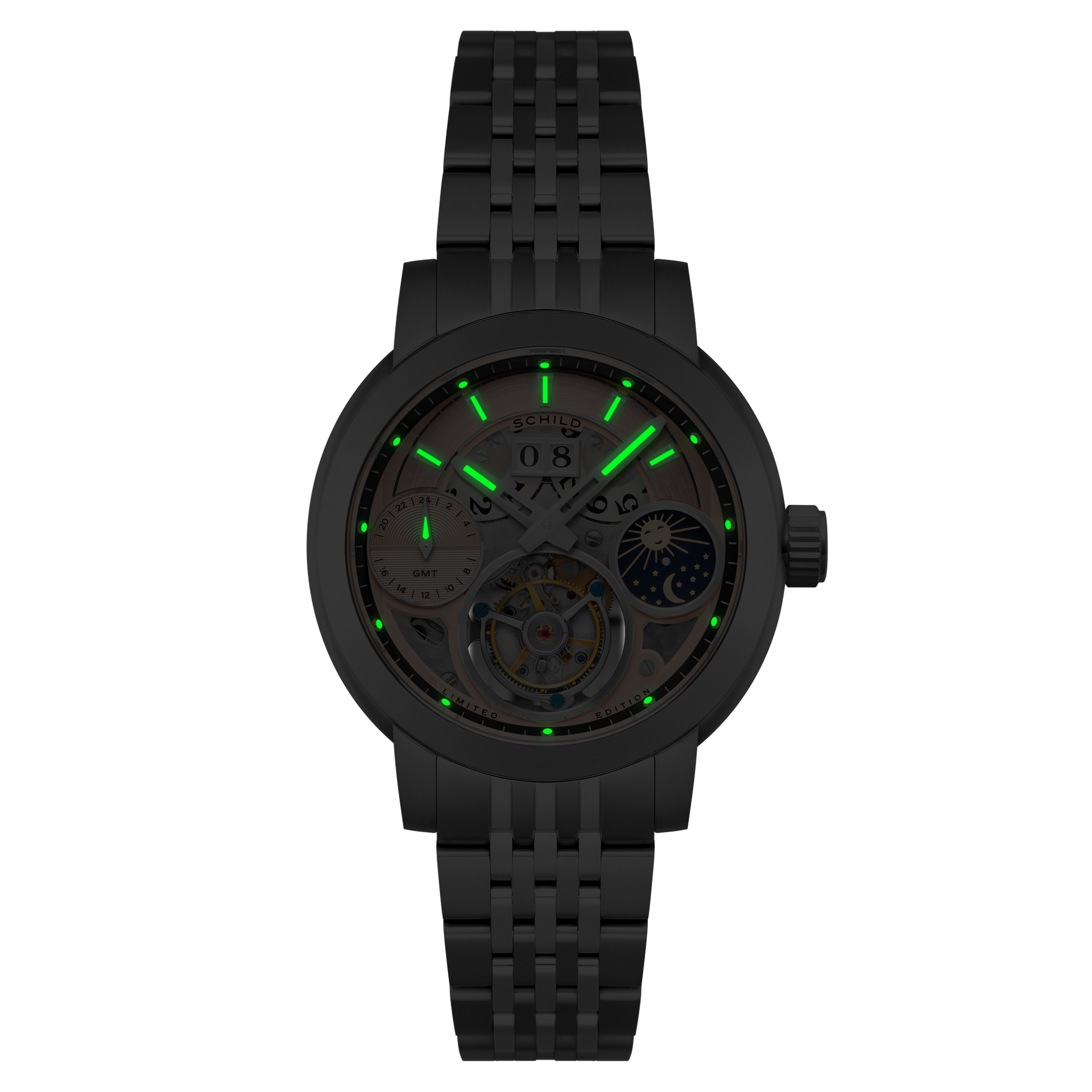Seamlessly uniting the complexity of a tourbillon with the dual functionality of a GMT and moonphase, this extraordinary tourbillon redefines the boundaries of precision and craftsmanship. While the dial is a canvas of haute horlogerie, the transparent caseback offers an intimate view of the intricate movement—an enduring testament to Schild’s dedication to excellence.