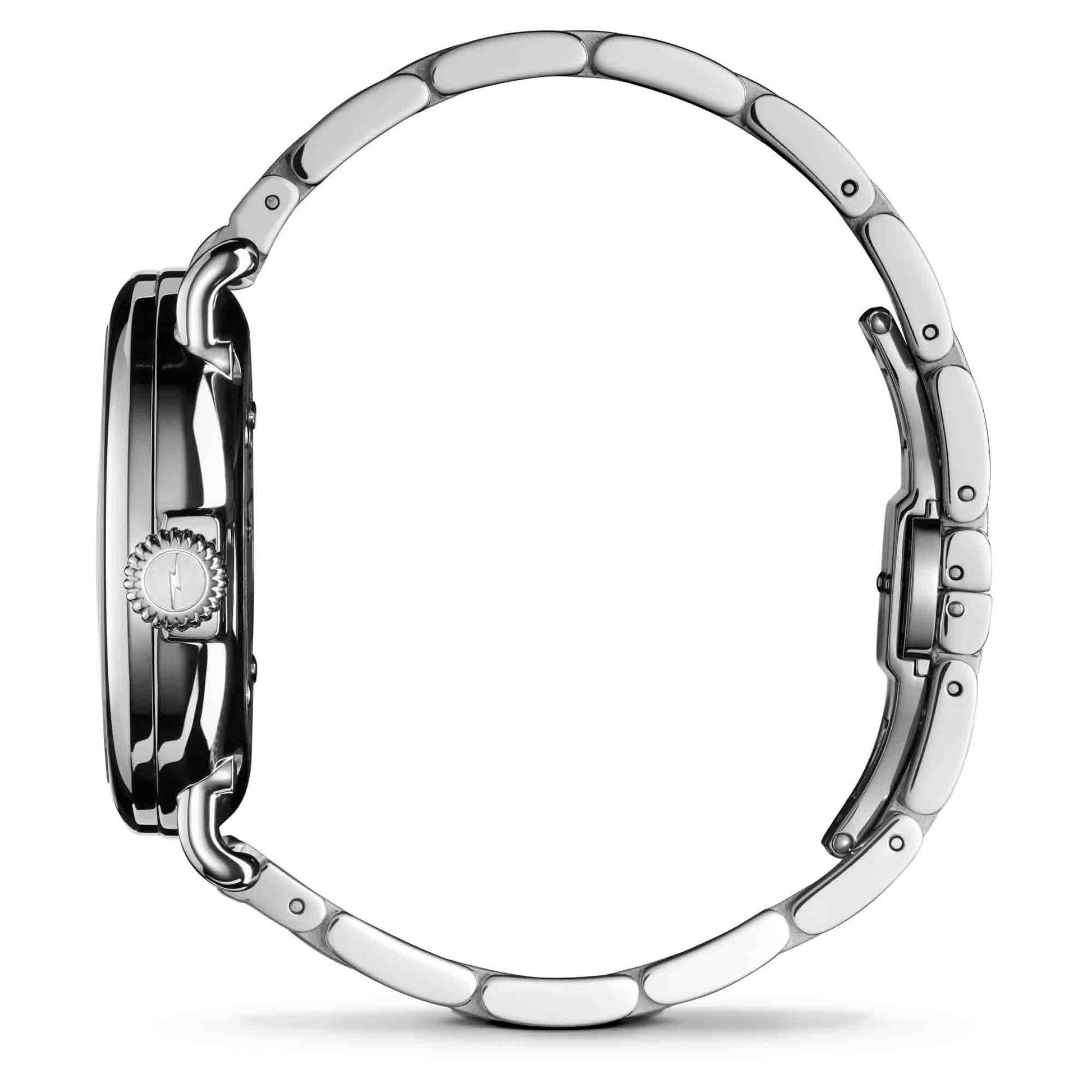 The Shinola flagship timepiece in a scaled-down size that complements any wrist. Built to last and named accordingly, this Runwell features a striking cadet blue mother of pearl dial. Crafted as only mother nature can, every dial is one-of-one and unique to the wearer. The look is brought together by the cool tones of the stainless steel case and bracelet. The hands and calendar aperture are powered by the Argonite 705 movement. And like every Runwell, it features Shinola's signature calling cards: Wire lugs, a pumpkin crown, iconic caseback—and is proudly designed and assembled in Detroit.